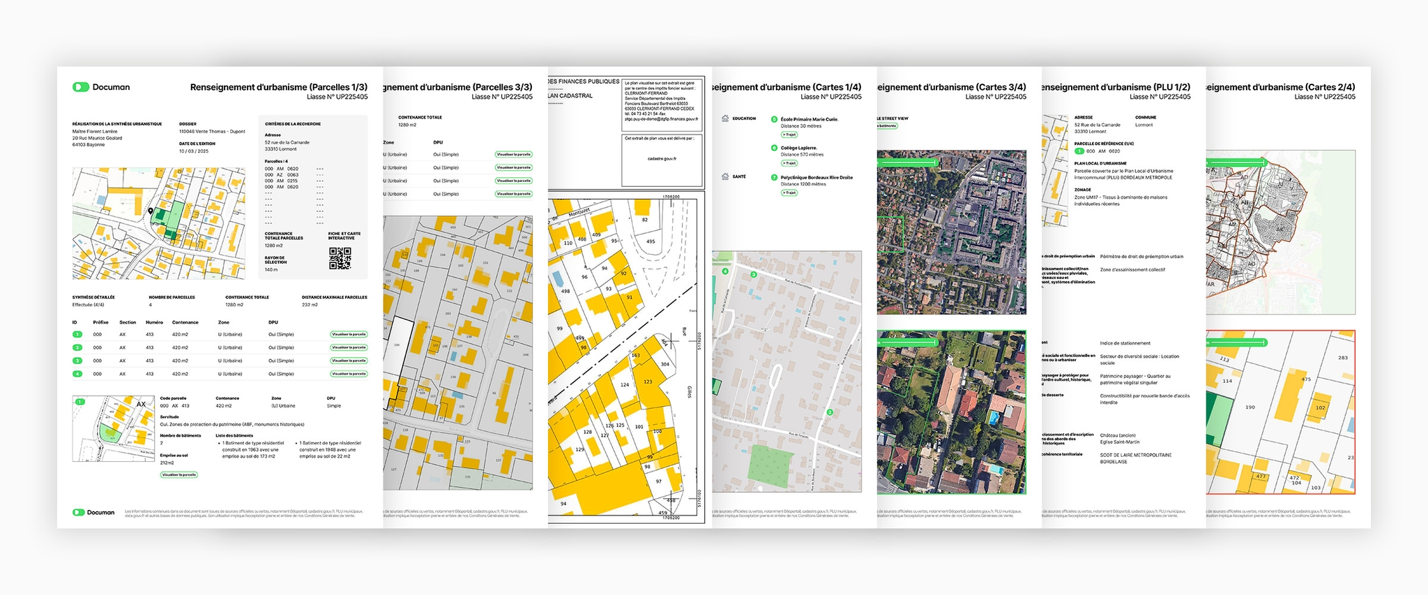 Notre Liasse Urbanisme est la plus pratique et visuelle pour analyser un bien dans son contexte parcellaire. Conçue pour les notaires, elle offre une lecture stratégique du cadre urbain, juridique et géographique d’un dossier. Fini les recherches fastidieuses sur le cadastre : notre liasse centralise les informations clés dans un document clair et exploitable. Elle peut aussi remplacer certaines notes d’urbanisme et éviter l’accumulation de pièces techniques, en fournissant tout le nécessaire sans lourdeur.