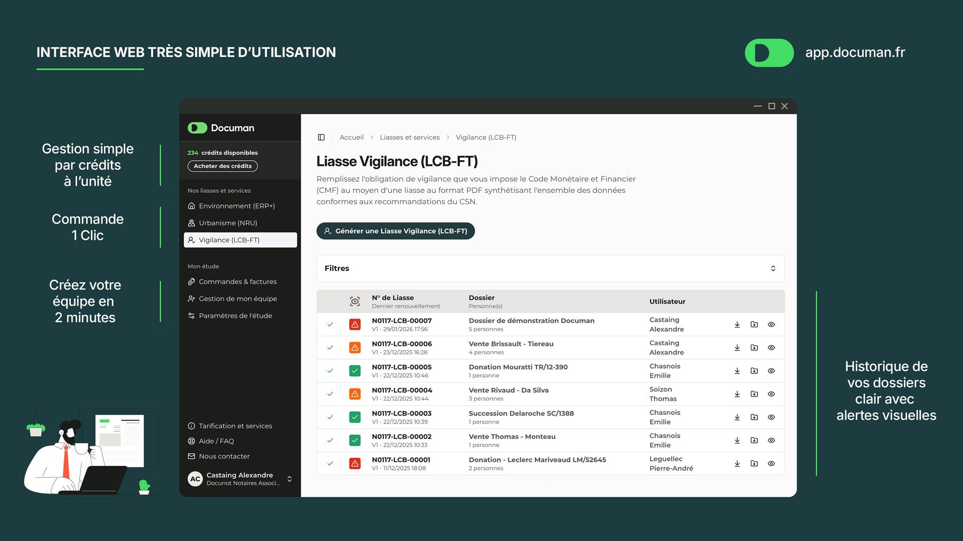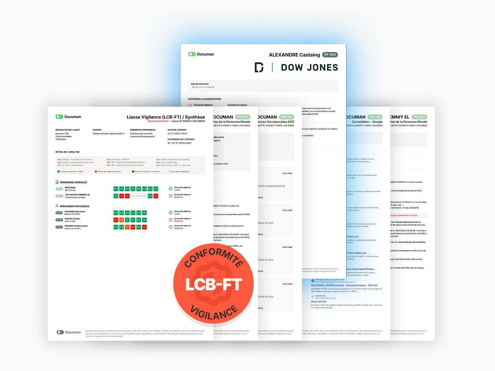 Pour chaque dossier, Documan fournit une synthèse structurée de l’ensemble des vérifications obligatoires, conforme aux recommandations du CSN. ✅ Intègre désormais les données Dow Jones.